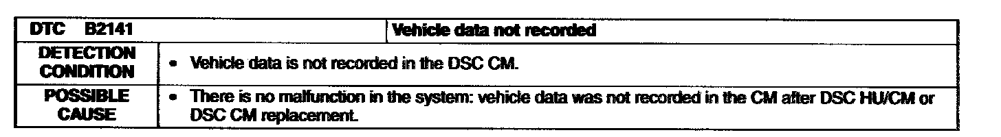 DTC B2141 [DYNAMIC STABILITY CONTROL (DSC)]Note: The DSC indicator light illuminates and remains illuminated, and DTC B2141 (vehicle data not recorded) is stored in the memory only when the ignition switch is turned to the ON position for the first time after DSC HU/CM or DSC CM replacement. Since the vehicle data is downloaded from the PCM via a CAN fine when the ignition switch is turned to the ON position, DTC B2141 is only stored as a past malfunction when the ignition switch is turned off and then turned to the ON position.
