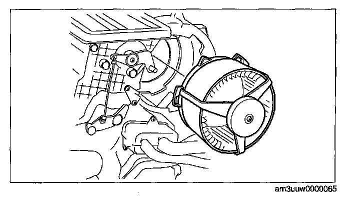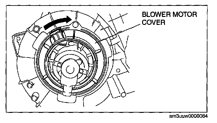 CAUTION: When the blower motor cover is removed, the blower motor could fall in the A/C unit case causing the sirocco fan to be damaged. Therefore another person must hold the blower motor at the installation position.