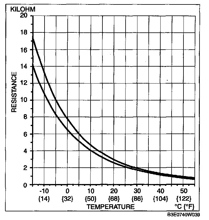 - If the characteristics of the passenger compartment temperature sensor are not as shown in the graph, replace the passenger compartment temperature sensor.