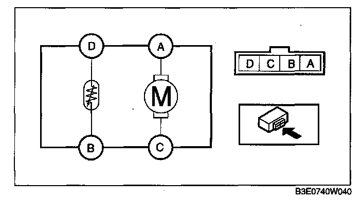 2. Connect battery positive voltage to passenger compartment temperature sensor terminal A and connect terminal C to ground to verify fan operation.