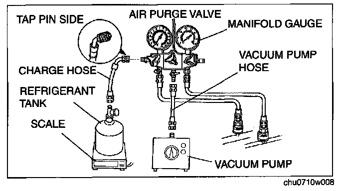2. Connect the tap pin side of the charging hose to the air purge valve of the manifold gauge.