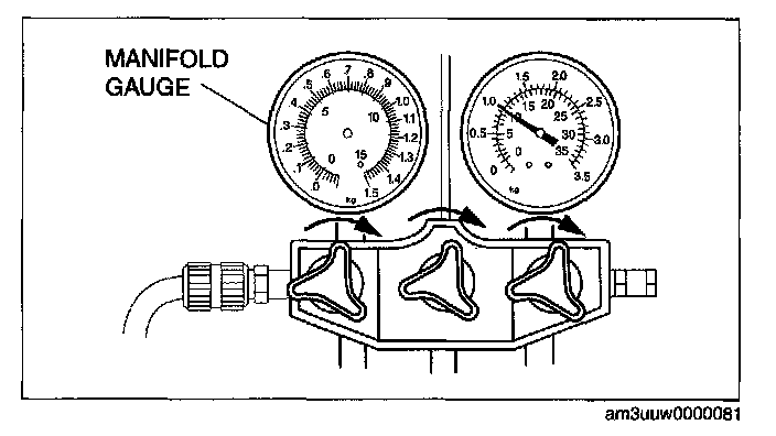 3. Verify that high- and low-pressure side readings of the manifold gauge are at -101 kPa {-760 mmHg, -29.9 inHg}. Close each valve of the manifold gauge.