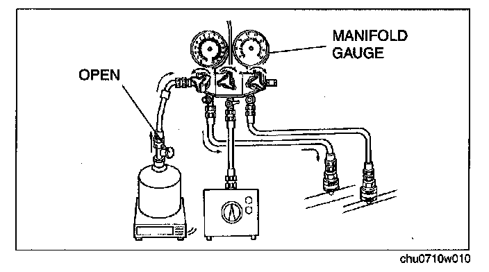 CAUTION: Always being charging of refrigerant from the high-pressure side. If changing is begun from the low-pressure side, the vanes of the A/C compressor will not be released and abnormal noise may result.
