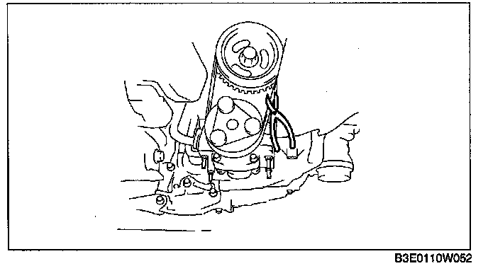^ Do not pass jig (B) through the A/C compressor mount hole.