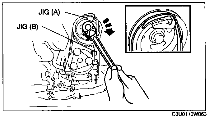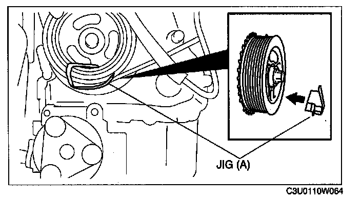 3. Install a jig (A) to the crankshaft pulley as shown in the figure.