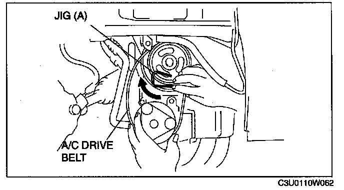 4. Install a new A/C drive belt to the A/C compressor pulley, move jig (A) upward, and then install the A/ C drive belt to the crankshaft pulley.