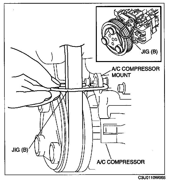5. Install jig (B) to the A/C compressor mount as shown in the figure.