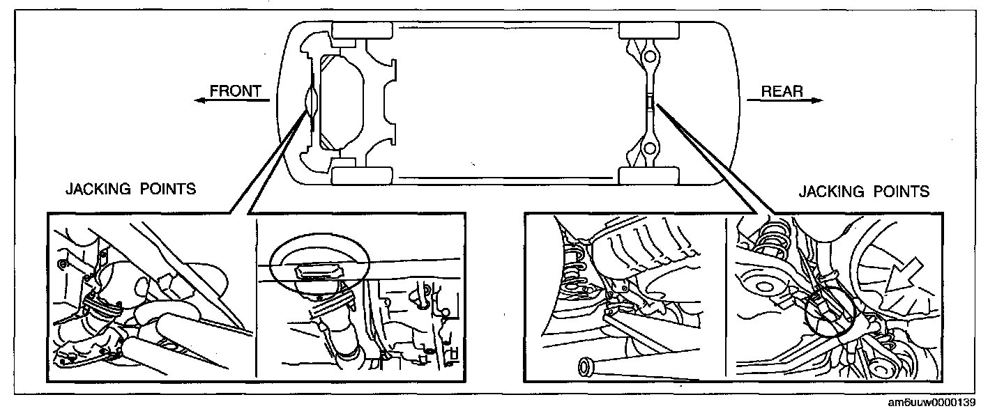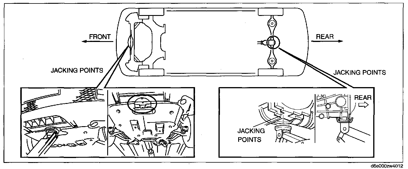 JACKING POSITIONS, VEHICLE LIFT (2 SUPPORTS) AND SAFETY STAND (RIGID RACK) POSITIONSJacking Positions