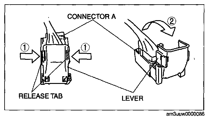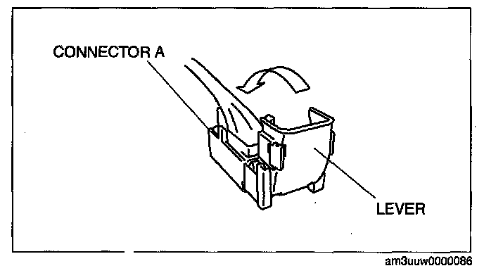 2. Rotate the lever in the direction of the arrow and remove connector A.