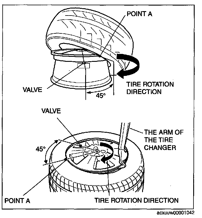 4. Set the tire changer so that it is 45° away (point A) from the valve hole.