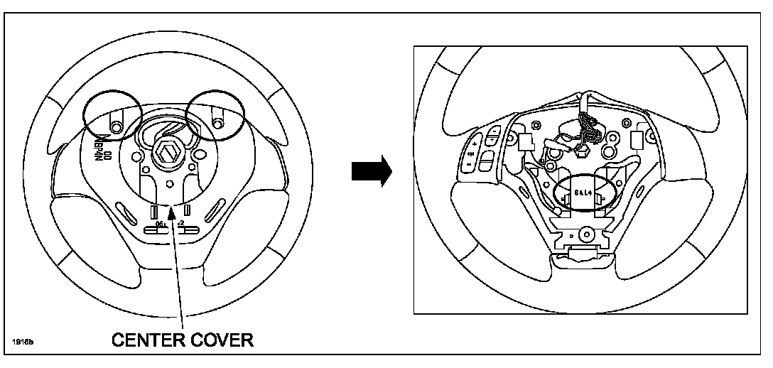 3. Remove the two screws from the back of the steering wheel, then release the fastener from the front surface of the steering wheel and remove the center cover.