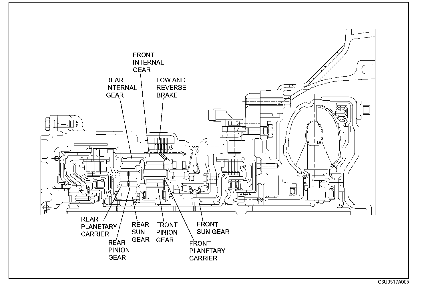 ^ The front sun gear is installed inside of the front pinion gears, and the front internal gear is installed outside of the front pinion gears. The front sun gear is engaged with the forward clutch hub, and the front internal gear is engaged with the rear planetary carrier.