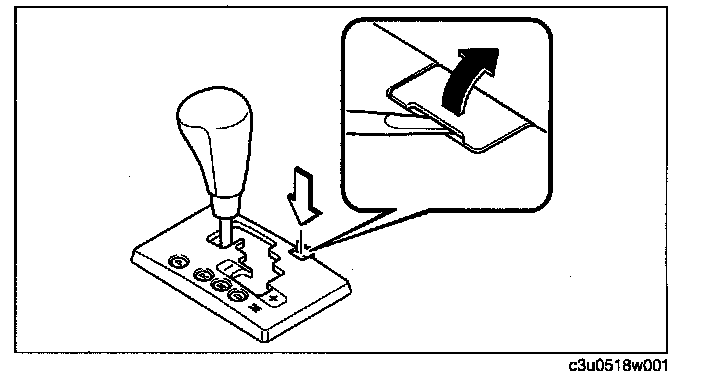 5. Insert the screwdriver into the emergency override hole and push it down. Verify that the selector lever can be shifted from the P position. If there is any malfunction, replace the selector lever component.