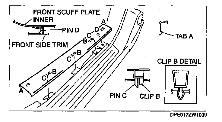 1. Pull the front scuff plate inner upward while detaching tabs A, detach clips B, pins C and D from the body, and then remove the front scuff plate inner.