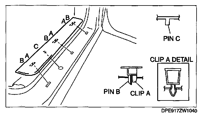 1. Pull the front scuff plate outer upward, detach clips A, pins B and C from the body, and then remove the front scuff plate outer.