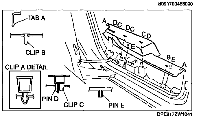 REAR SCUFF PLATE REMOVAL/INSTALLATION1. Pull the rear scuff plate upward while detaching tabs A, detach clips B and C, and pin D and E from the body, and then remove the rear scuff plate.