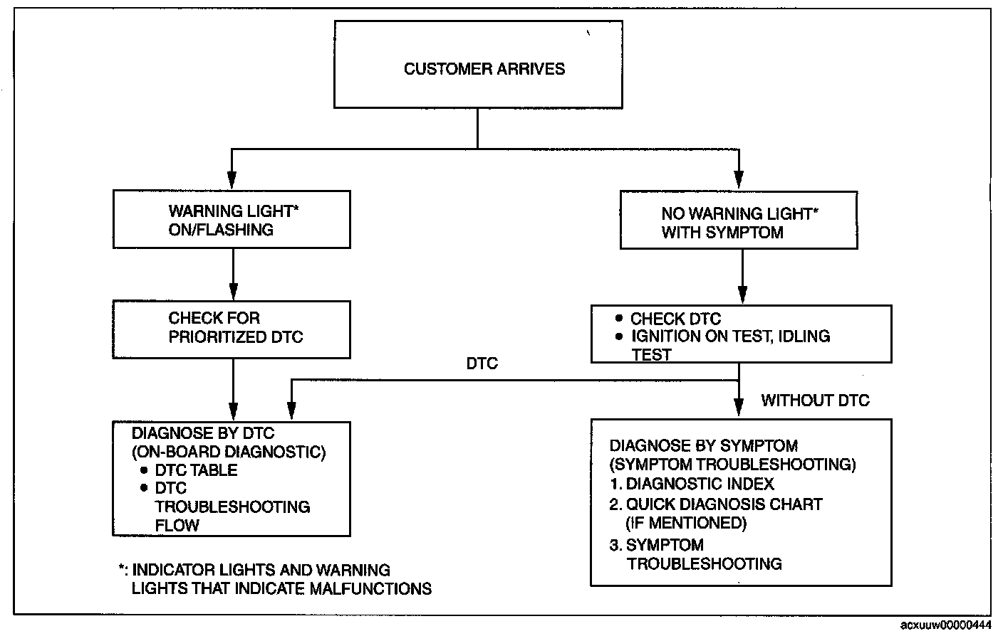 - DTC troubleshooting flow shows diagnostic procedures, inspection methods, and proper action to take for each DTC.