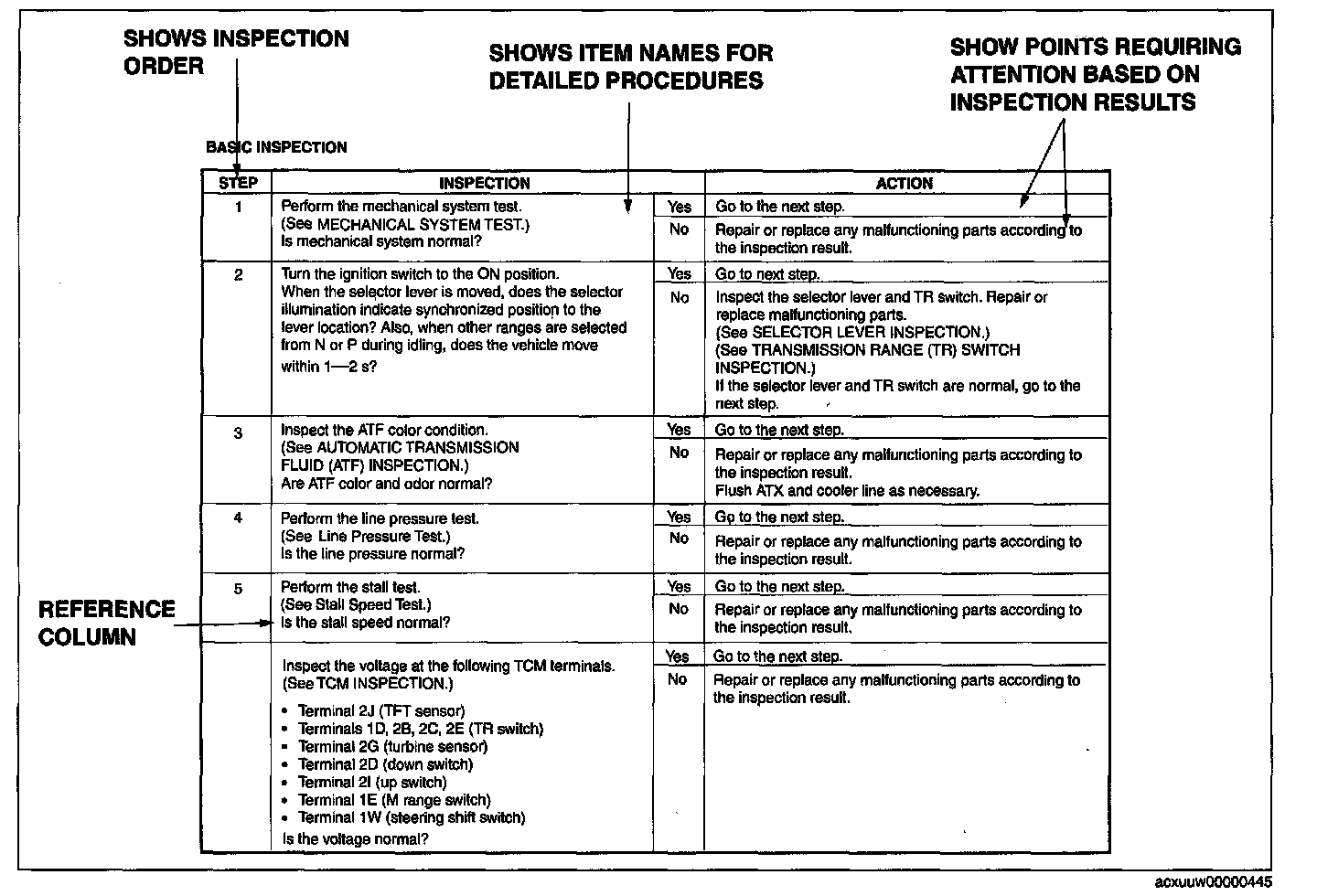 - Although inspections and adjustments are performed according to the reference column procedures, if the cause of the malfunction is discovered during basic inspection, continue the procedures as indicated in the action column.