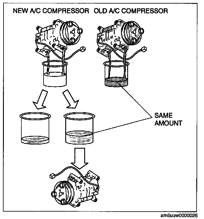 1. Rotate new A/C compressor shaft six to eight revolutions while collecting refrigerant oil in a clean measuring device. Use this refrigerant oil to refill new compressor. Do not allow refrigerant oil to become contaminated.