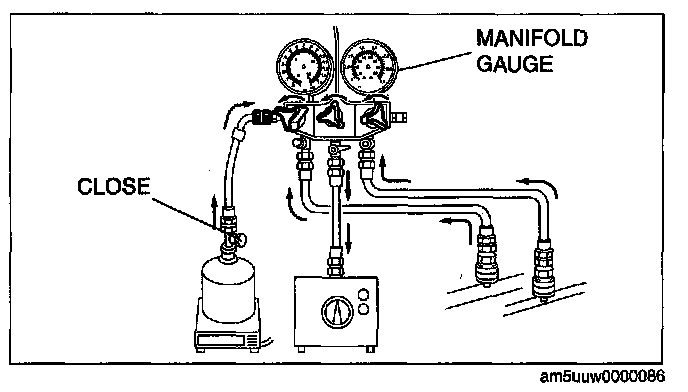 CAUTION: Close the manifold gauge valve immediately after stopping the vacuum pump. If the valve is left open, the vacuum pump oil will flow back into the refrigeration cycle and cause a decrease in the efficiency of the air conditioner.