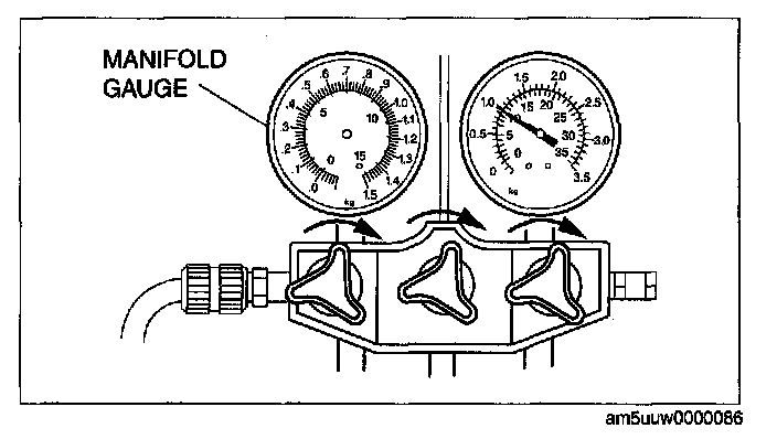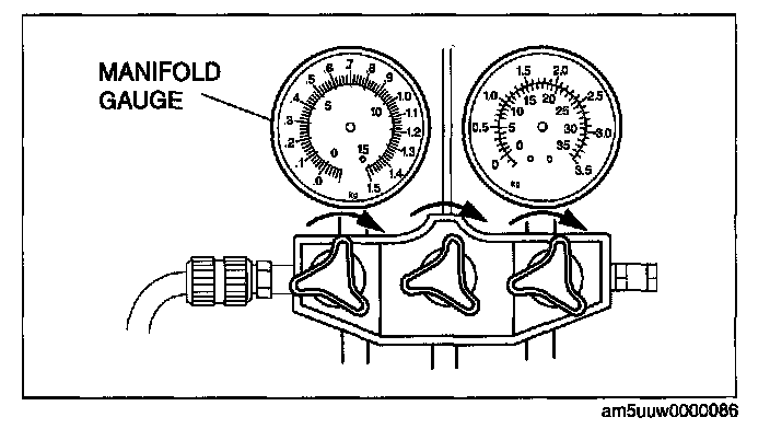4. When the low-pressure side reading increases to 0.098 MPa {1.0 kgf/sq.cm, 14 psi}, close the high-pressure side valve of the manifold gauge.