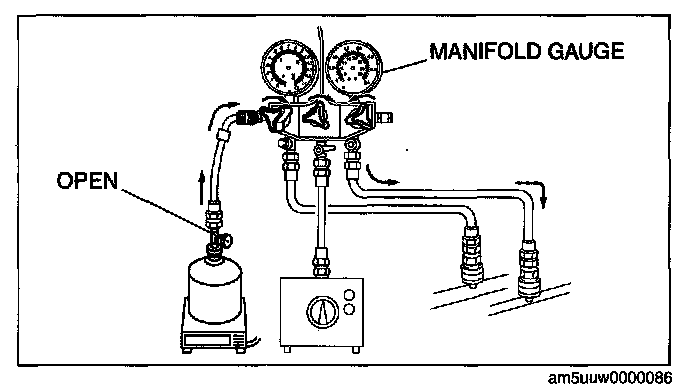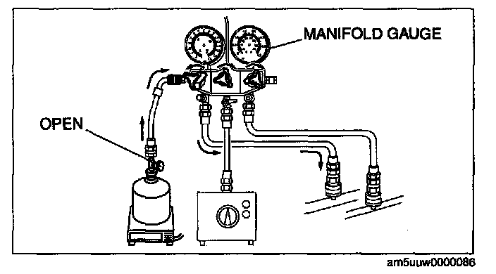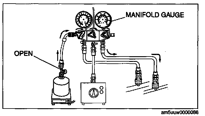 7. Open the high-pressure side valve of the manifold gauge and charge with refrigerant until the weight of refrigerant tank has decreased 2509 {8.83 oz} from the amount in Step 2.