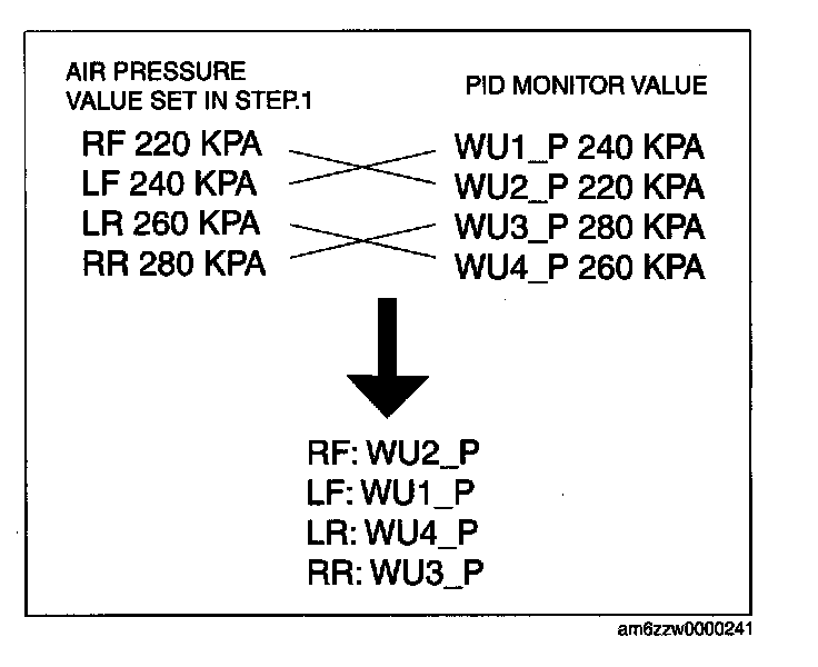 7. Determine which wheel unit identification code matches which wheel and tire by comparing the PID monitor values with the air pressure values set in Step 1.