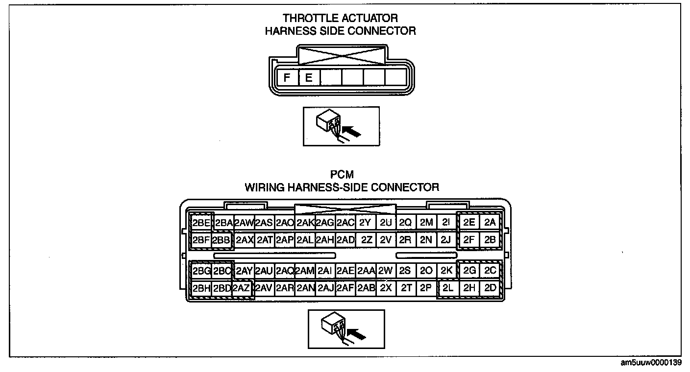 - Throttle actuator terminal F and PCM terminal 2BE