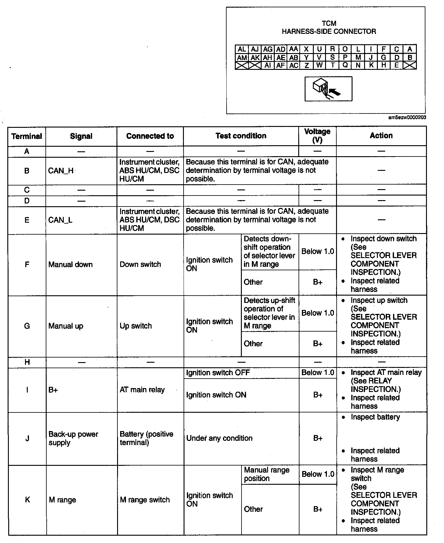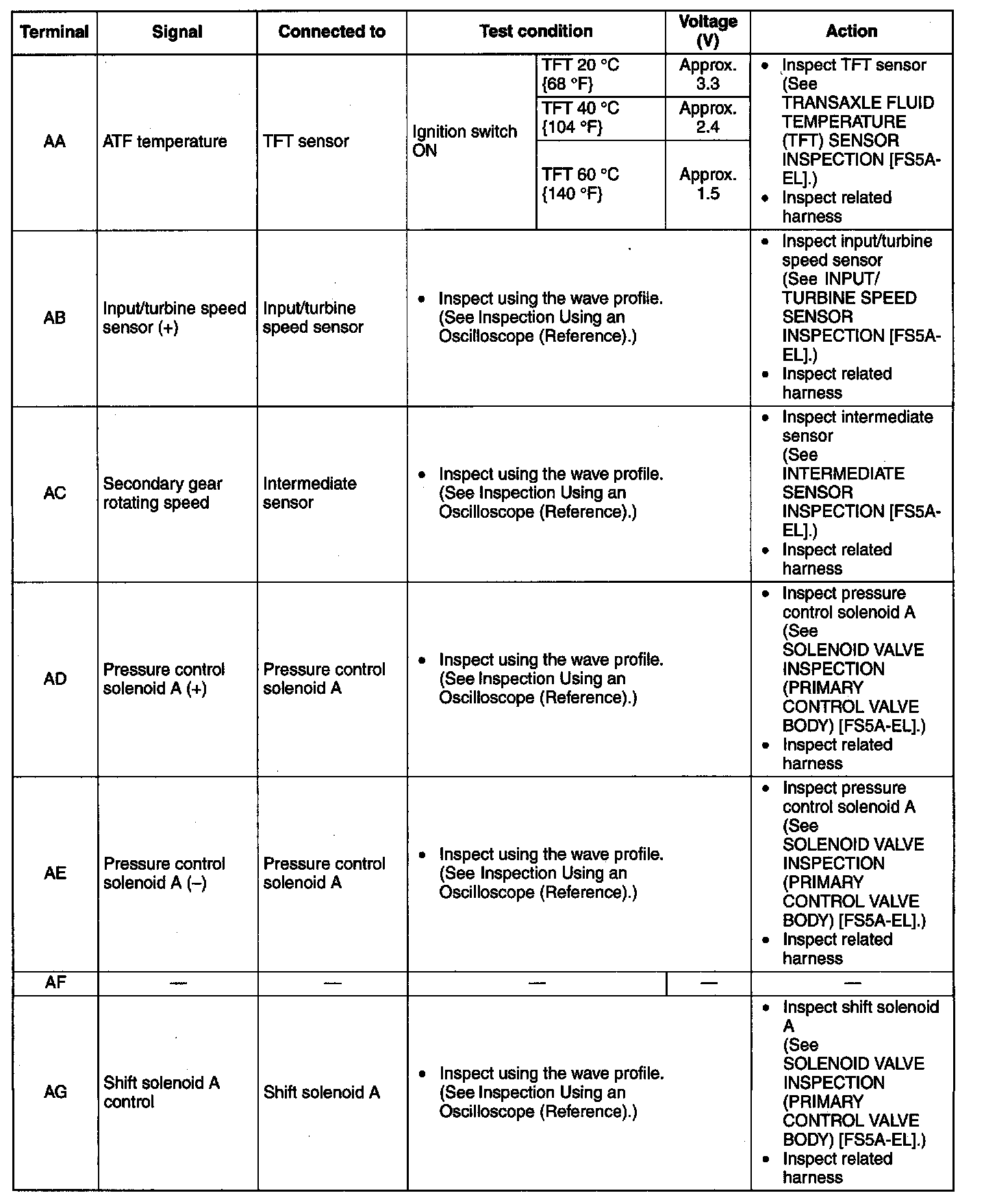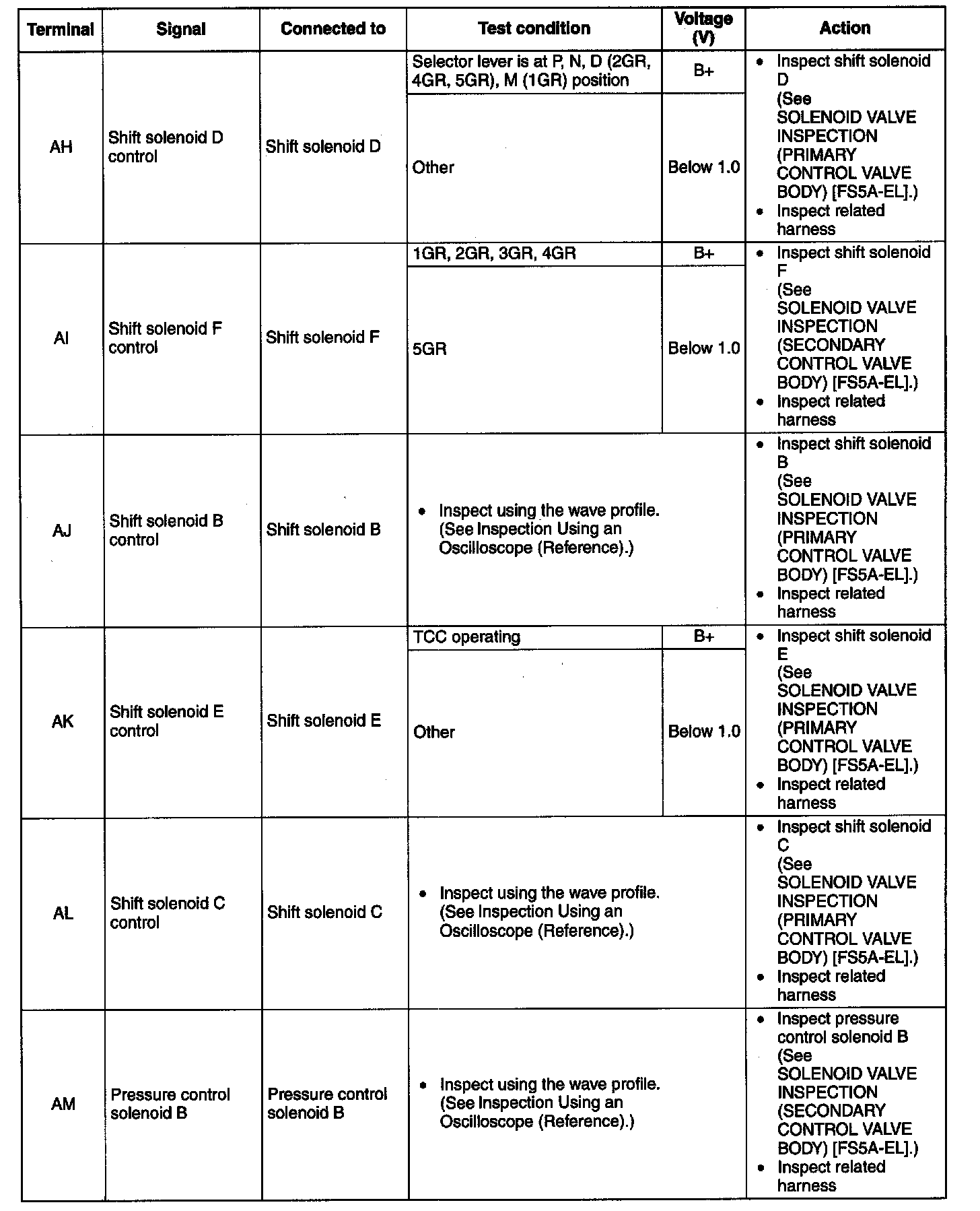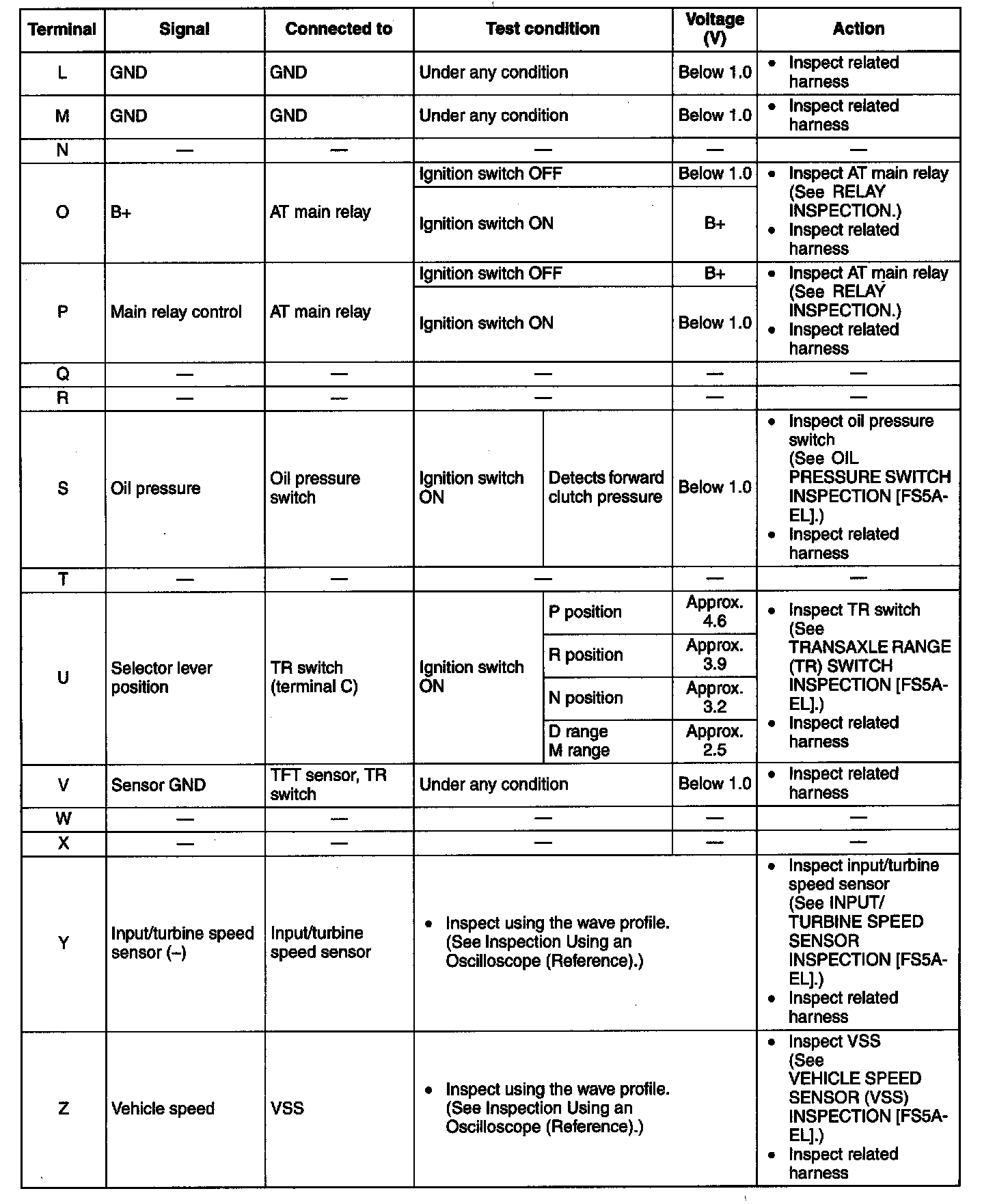 ^ The TCM terminal voltages vary with changes in measuring and vehicle conditions. Always carry out a total inspection of the input and output systems, and the TCM to determine the cause of trouble. Otherwise, a mis-diagnosis could occur.