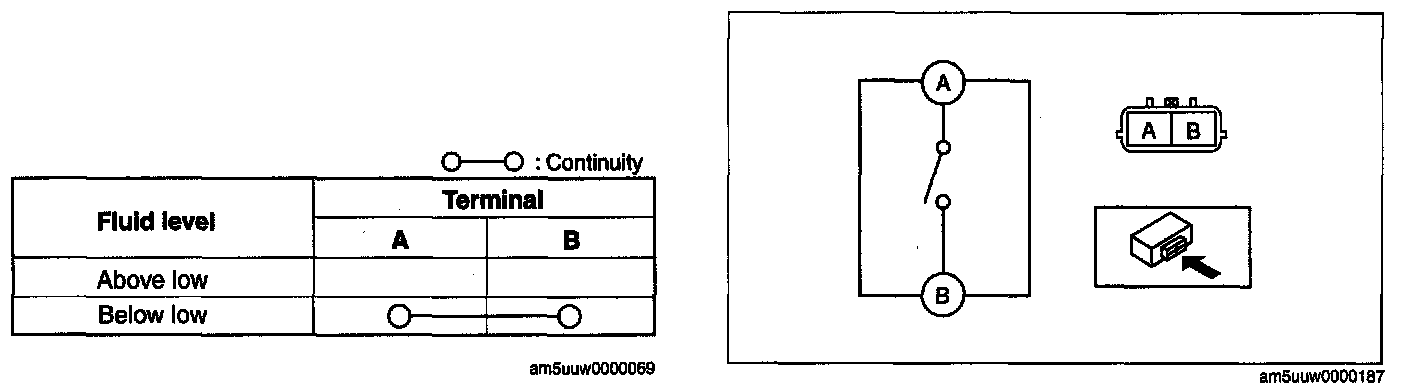 2. Inspect for continuity between the washer fluid-level sensor terminals using an ohmmeter.