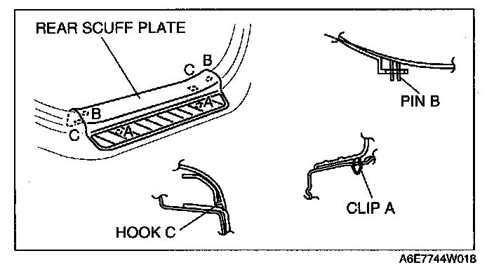 upward, then disengage clips A, pins B, and tabs C from the body, and remove the rear scuff plate.