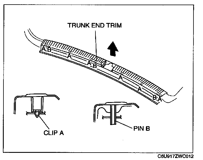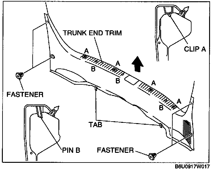 1. Pull the trunk end trim upward, then disengage clips A and pins B from the body.