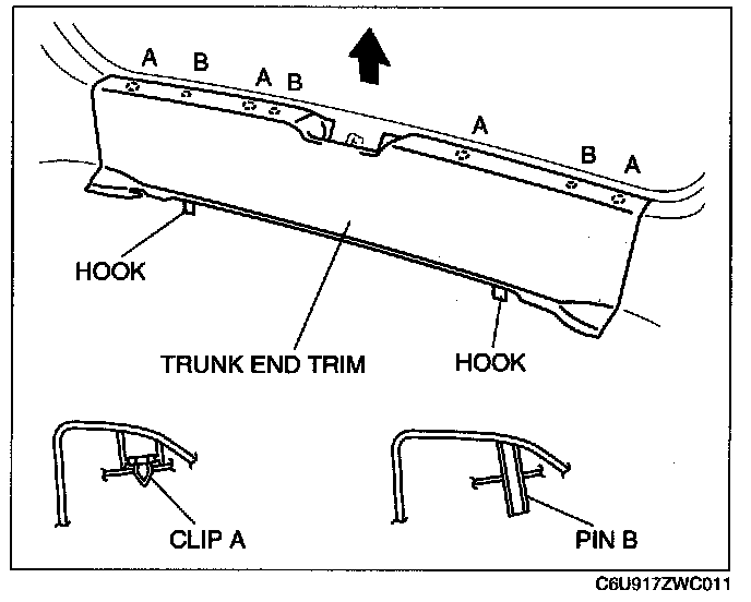 1. Pull the trunk end trim upward, then disengage clips A, pins B, and hooks.