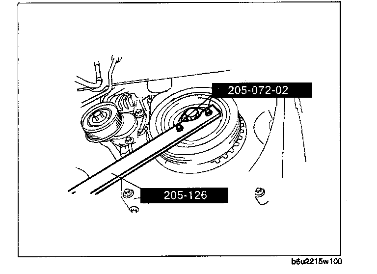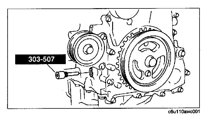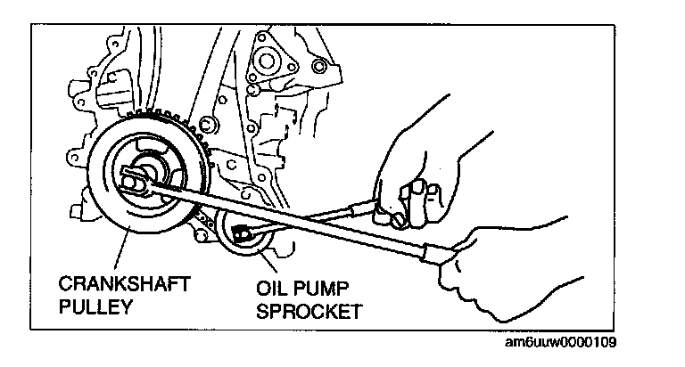 1. Temporarily install the crankshaft pulley and crankshaft pulley lock bolt to the crankshaft, and lock the oil pump against rotation as shown in figure.