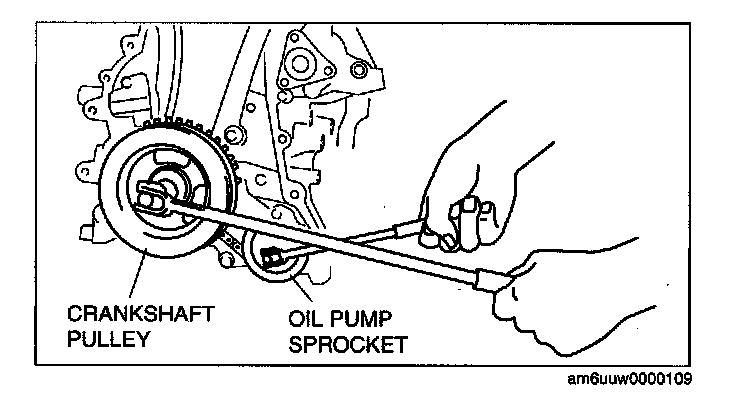 2. Install the oil pump sprocket, and then remove the crankshaft pulley and crankshaft pulley lock bolt.