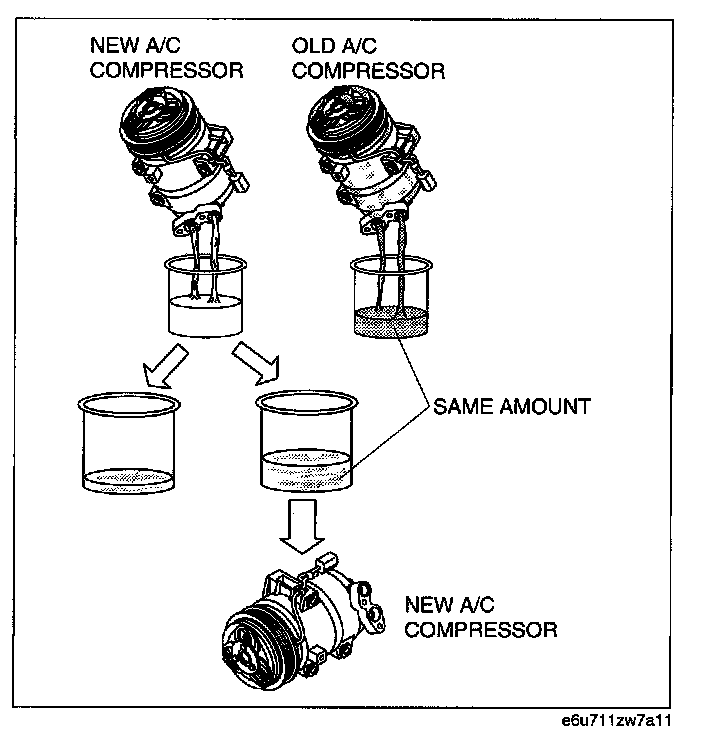 1. Rotate new A/C compressor shaft six to eight revolutions while collecting refrigerant oil in a clean measuring device. Use this refrigerant oil to refill new compressor. Do not allow refrigerant oil to become contaminated.