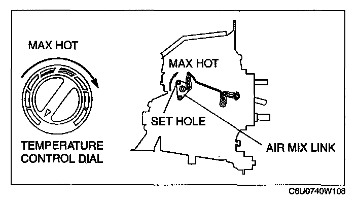 2. Set the air mix link to max hot in the direction shown by the arrow and insert a screwdriver at the set hole.