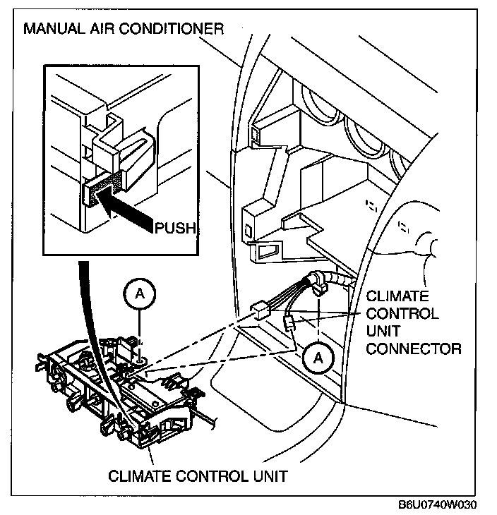 6. Disconnect the climate control unit connectors and remove the climate control unit. (Manual air conditioner)