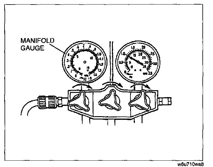 9. Verify that high and low-pressure side readings of the manifold gauge are at-101 kPa {-760 mmHg, -29.9 inHg}.Close each valve of the manifold gauge.