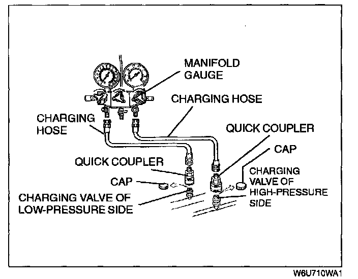 2. Connect the charging hoses to the high and low-pressure side joints of the manifold gauge.