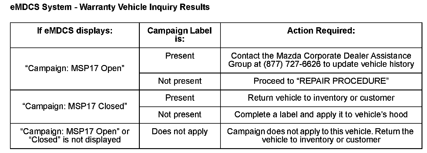 ^ BEFORE PERFORMING ANY REPAIR, VALIDATE THAT THE VEHICLE IS APPLICABLE TO THIS PROGRAM BY PERFORMING AN "eMDCS WARRANTY VEHICLE INQUIRY" AND VERIFYING THE VEHICLE DISPLAYS CAMPAIGN "MSP17" AND ITS CAMPAIGN STATUS DISPLAYS "OPEN". SEE "VEHICLE INSPECTION PROCEDURE" BELOW.