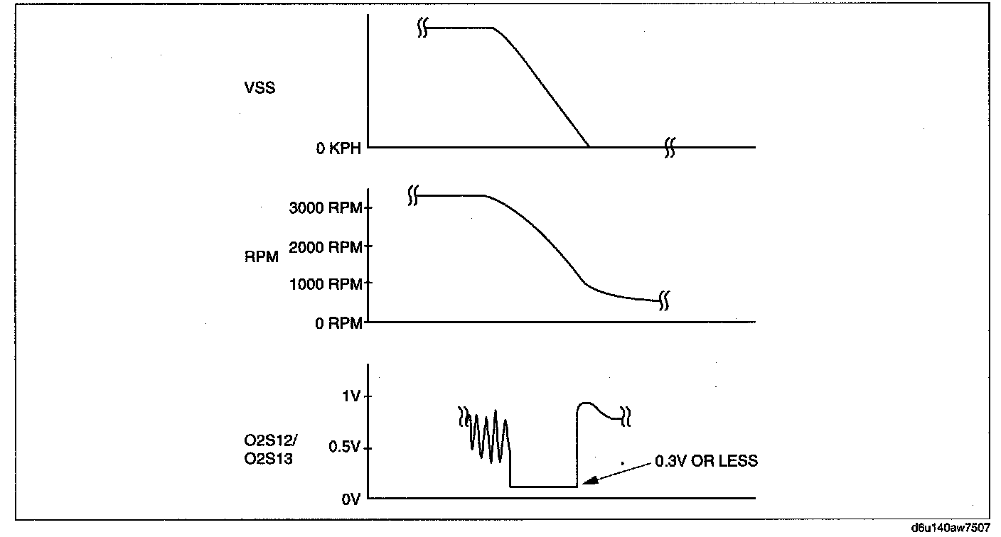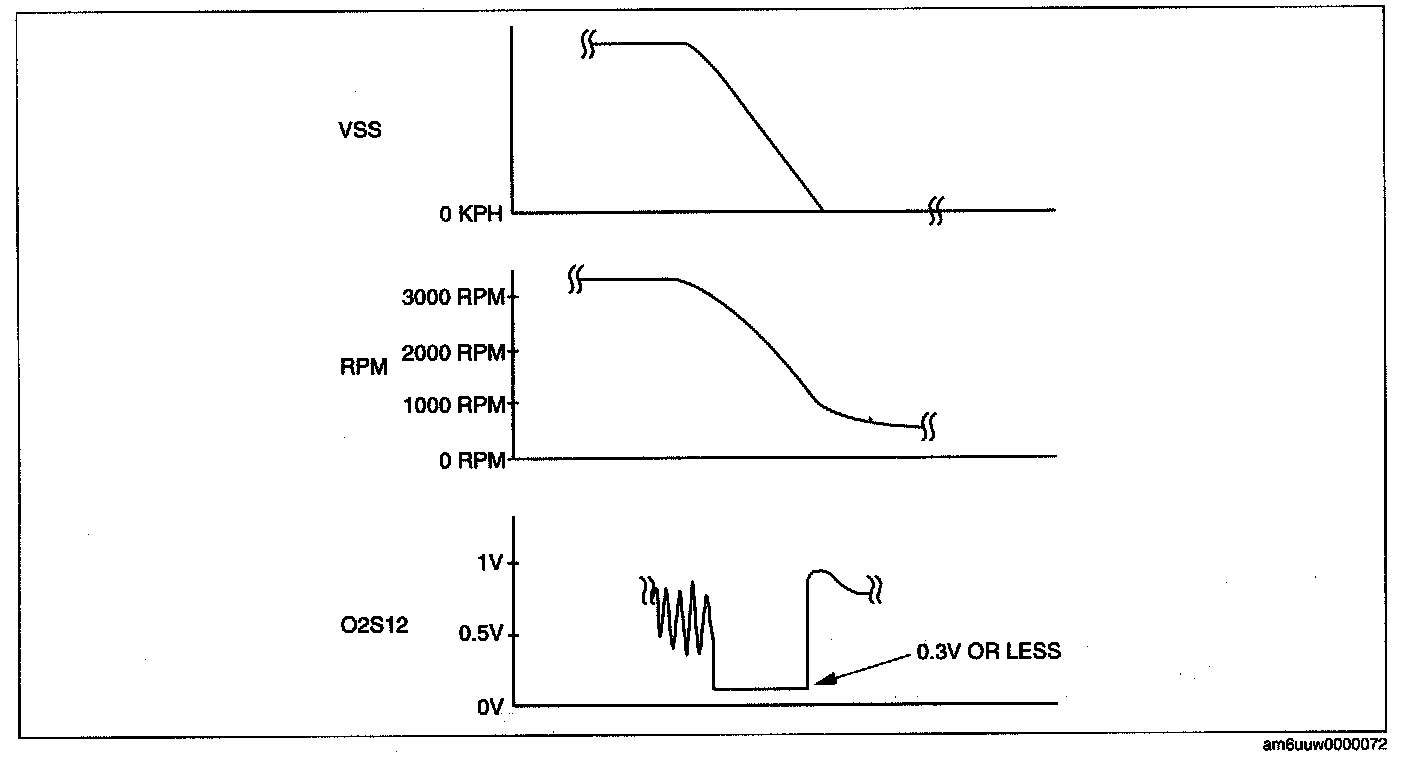4. Verify that the rear HO2S outputs a voltage of 0.6 V or more, one time or more, then verify that the rear HO2S voltage (PID: 02S12) is 0.3 V or less while decelerating as shown in the figure.