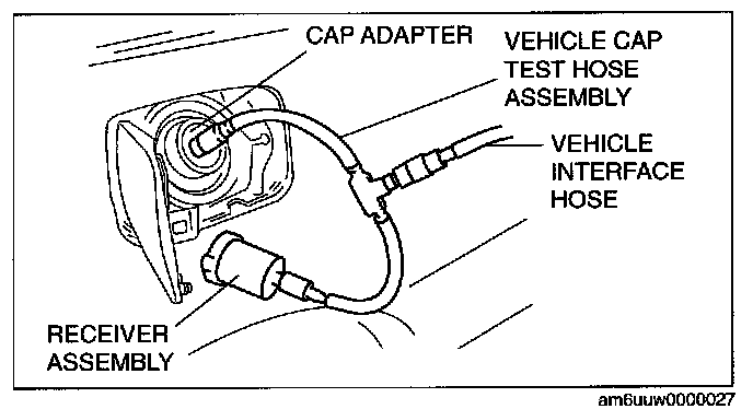 3. Connect the receiver assembly (SST: 134-01059) to the vehicle cap test hose assembly (part of SST) and the fuel-filler cap from the vehicle.