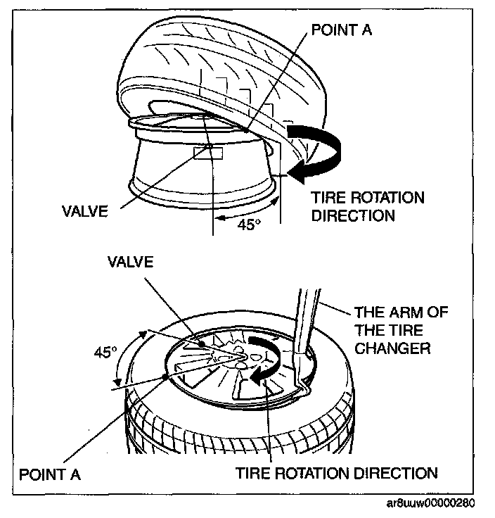 4. Set the tire changer so that it is 45° away (point A) from the valve hole.