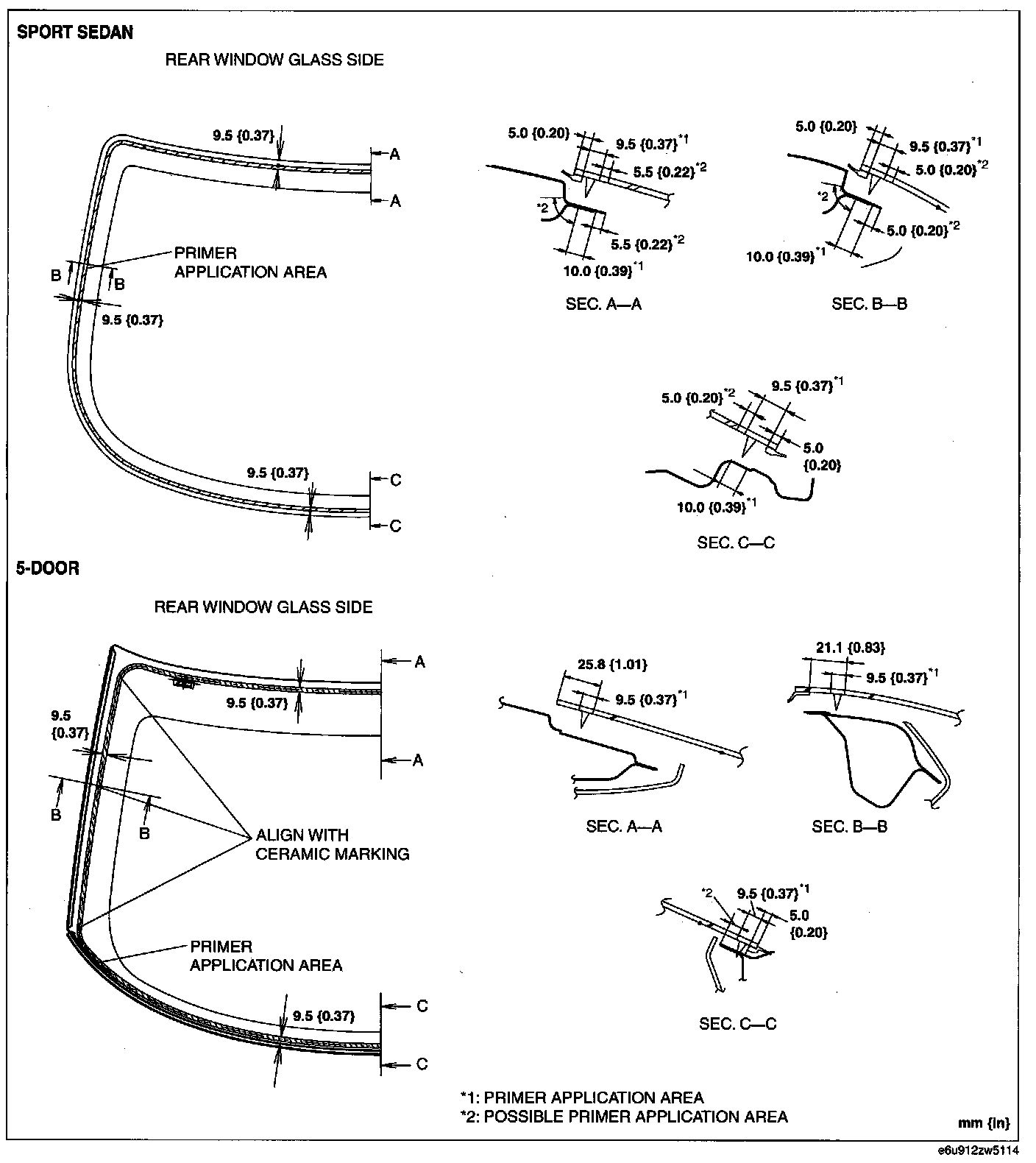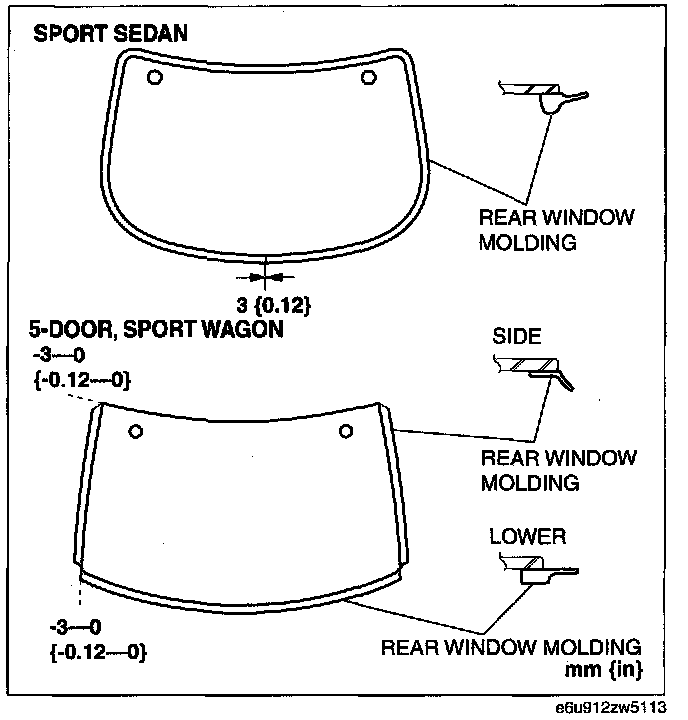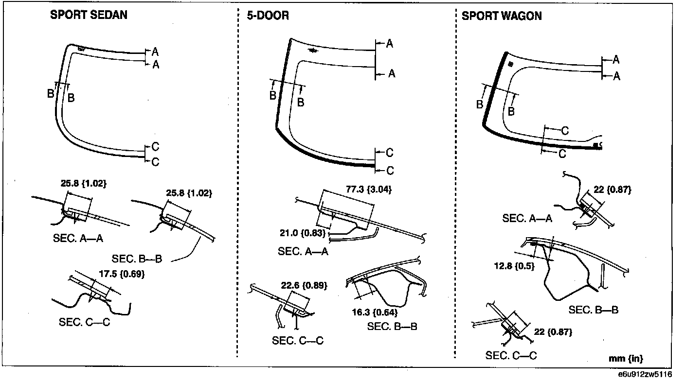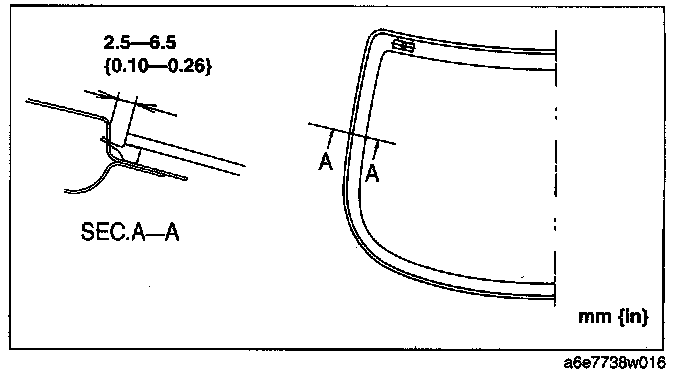 9. Verify that the gap of the upper part is 7.3 mm {0.29 in) and the A pillar part is 6.8 mm {0.27 in}. (Only for Sport sedan)