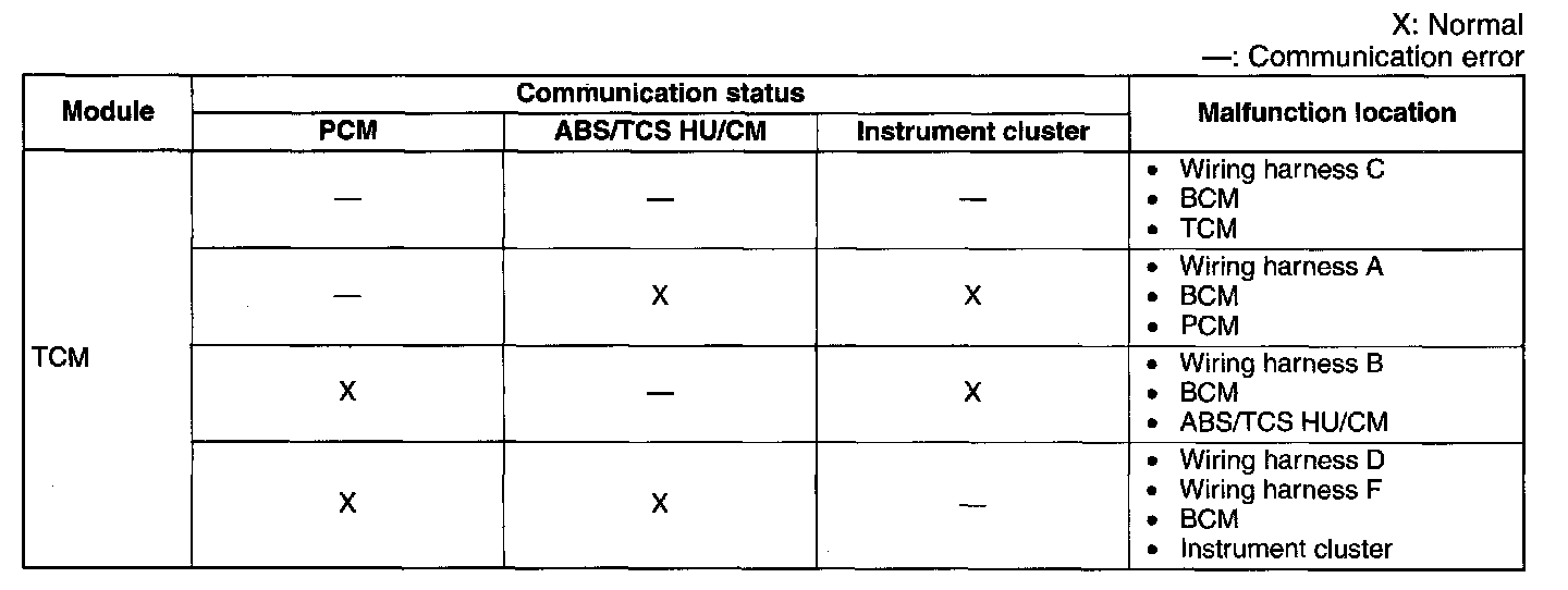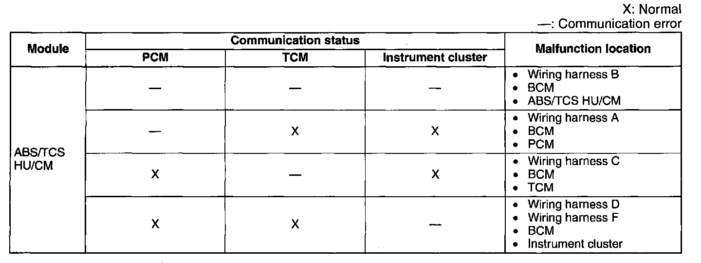 1. Check the display of DTC U0100, U0121 (AW6A-EL), U0140 (AW6A-EL) and/or U0415 (AW6A-EL) using the M-MDS.DTC TABLE [MULTIPLEX COMMUNICATION SYSTEM (L3, AJ)]. Diagnostic Trouble Code Descriptions