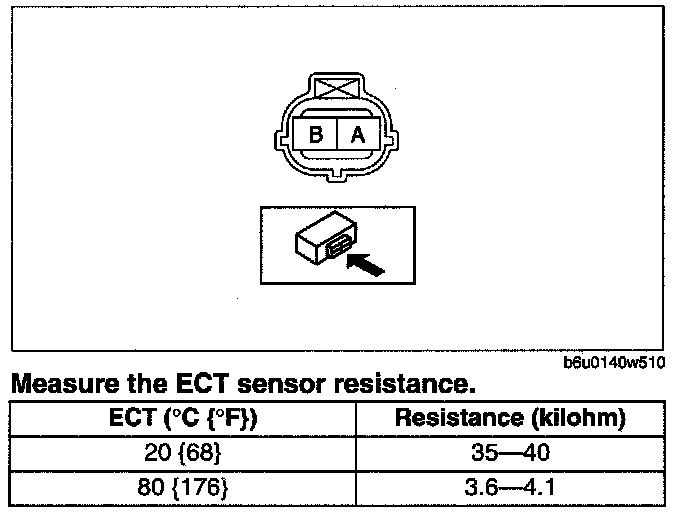 3. Measure the resistance between ECT sensor terminals A and B using an ohmmeter.