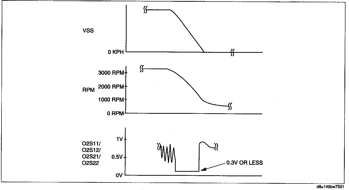 4. Verify that the HO2S outputs a voltage of 0.6 V or more, one time or more, then verify that the HO2S voltage (PID: 02S1 l/02S12/02S21/02S22) is 0.3 V or less while decelerating as shown in the figure.