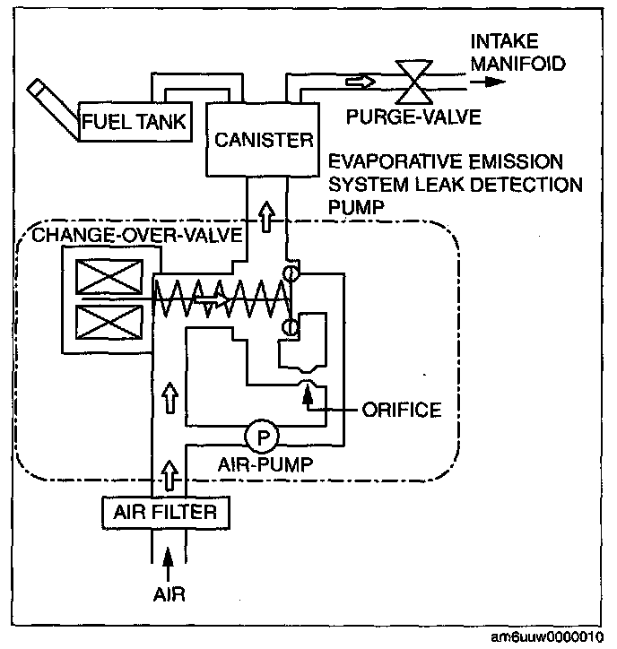 - The EVAP system test finds gas leaks in the system using the PCM to monitor changes in the air pump load current of the EVAP system leak detection pump. This test starts after sending an on-demand test signal from the M-MDS to the PCM. The PCM controls the air pump and change-over-valve operation and also stores the load current of the air pump as follows: