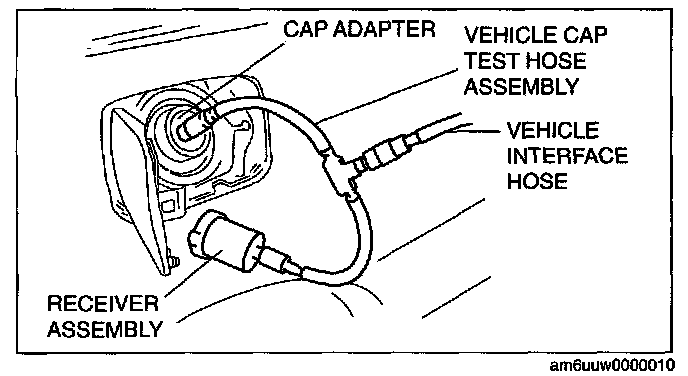 3. Connect the receiver assembly (SST: 134-01059) to the vehicle cap test hose assembly (part of SST) and the fuel-filler cap from the vehicle.